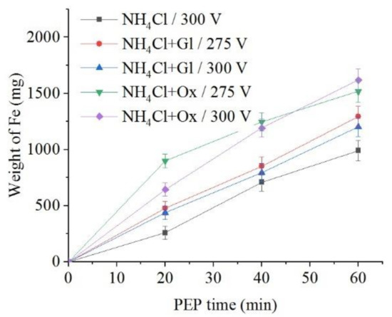Dependence of iron weight dissolved from the nitrided samples on the PEP duration in ammonium chloride (3%) solution at a temperature of 80 °C without or with glycerol or oxalic acid additions (5% each) at different voltages under forced electrolyte circulation.