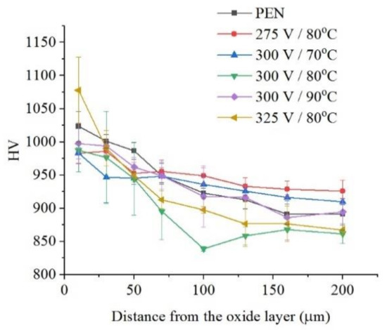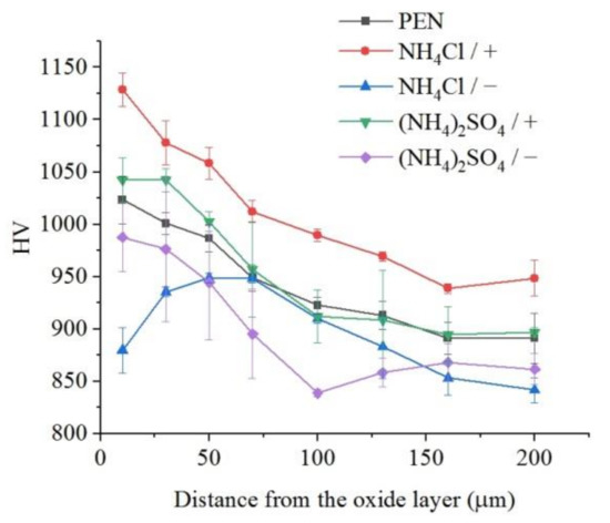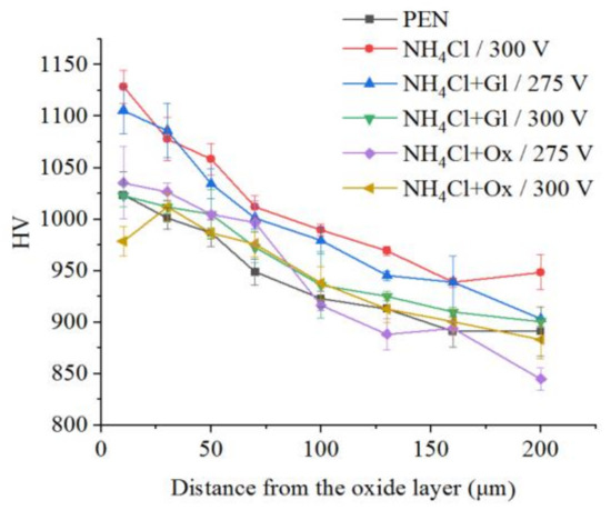 Distribution of microhardness in the surface layer of steel after PEN and subsequent PEP in ammonium chloride (3%) solution at a temperature of 80 °C without or with glycerol or oxalic acid additions (5% each) at different voltages under forced electrolyte circulation.