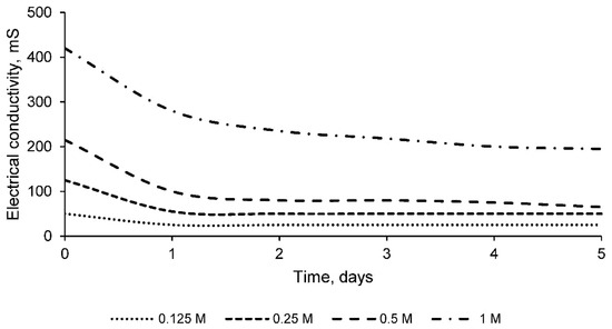 In turn, the results of the electrical conductivity for the 4 sulfuric acid solutions (0.125, 0.25, 0.5, and 1 molar) are shown in Figure 2 for different times, measured at a temperature of 25 °C.