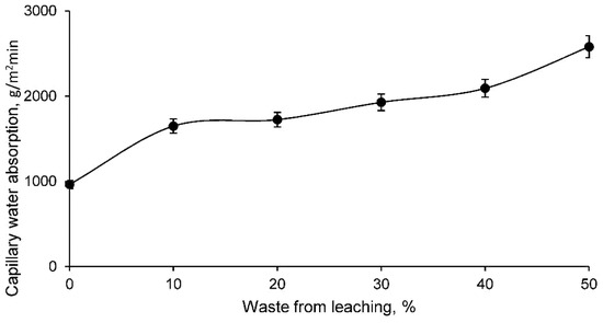 As expected from the results of linear shrinkage and weight loss, the capillary water absorption of the clay-conformed ceramics families and the leaching residue is higher the higher the percentage of waste. Consequently, there is a more open structure in the ceramics with leaching residue, in which there is a series of interconnected pores capable of absorbing a higher percentage of water by capillary action.