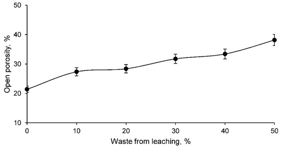 The open porosity of the clay-conformed ceramics with leach residue increases as the percentage of leaching residue increases. This was to be expected based on the test results detailed above and obviously conditions the strength of the material. However, higher porosity can improve certain properties of traditional ceramics such as thermal or acoustic insulation. Therefore, there is a wide variety of physical test results depending on the percentage of leaching residue in the ceramic, allowing to obtain ceramic materials for different applications.