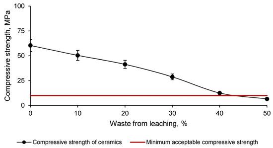 The compressive strength of ceramic materials intended for bricks is limited to 10 MPa according to European standards. Therefore, the family of ceramics conformed with 50% leaching residue and 50% clay is unusable. The other families of ceramics present compressive strengths higher than those established by the standards, taking into account that this strength decreases the higher the percentage of leaching residue in the ceramic. Consequently, the families conformed with clay and percentages of leaching residue of 10%, 20%, 30%, and 40% present physical and mechanical properties, according to the tests carried out, suitable for use in ceramic materials intended for the manufacture of bricks for construction.