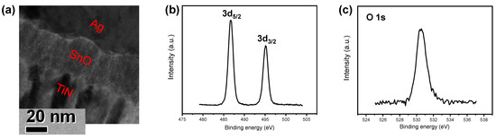 (a) TEM image of Ag/SnOx/TiN stack. XPS spectra of (b) Sn 3d and (c) O 1s.
