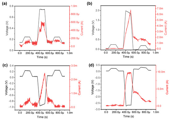 Next, we verified the pulse’s volatile switching, set, reset, and negative-set processes for practical switching operation. Figure 3a shows the volatile process in which the read pulse, set pulse, and read pulse are successively applied on the device. The read voltage (0.3 V) is set low in order not to affect the state significantly. A pulse of voltage with a magnitude of 0.8 V is insufficient to proceed with the set process, and when the main pulse is turned off, it is observed that there is no significant difference in the current before and after the main pulse. However, when a set voltage of 2 V is applied, the current increases in Figure 3b. Moreover, it was confirmed that the current increased after the set pulse was applied by 0.2 V read voltage. Figure 3c shows the reset process by pulse. The current is decreased after a reset pulse of −1 V. However, when a negative pulse with a larger amplitude is applied, the current is rather increased in Figure 3d. This can be explained by the negative-set phenomenon as confirmed by DC sweep.