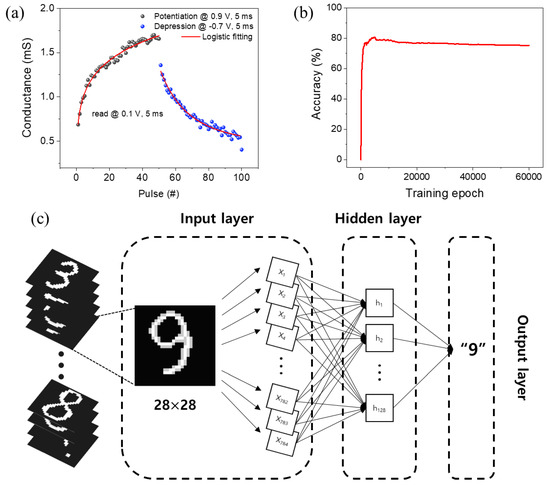 As shown in Figure 4a, the conductance values are controllable with the pulse, and the regular potentiation residual is less than ±0.0001, and the depression regular residual is less than ±0.00015 in the logistic fitting. To determine whether it is appropriate for the neuromorphic system, the Modified National Institute of Standards and Technology (MNIST) was used to analyze the LTP and LTD values as synaptic weights to recognize the handwriting of different people. In Figure 4c, in the input layer, two-dimensional images of 60,000 training samples that have 28 × 28 pixels respectively are transformed to one-dimensional 784 vectors that correspond to input neurons and transmit to 128 neuron nodes (h1…h256) in the hidden layer. The hidden layer calculates the weights and the strength of the synapse between the input and output layer based on the conductance values and logistic fitting values measured. The output layer prints the 10 numbers (from 0 to 9) from these weights via the 10,000 test images. Each synaptic device consists of an exhibitory device and an inhibitory device that correspond to the exhibitory weight G+ and inhibitory weight G−, respectively. The weight of the device is defined as Wij = G+ − G−. The inference scheme of this neural network system depends on the voltage. A binary MNIST image (white pixel) is a 1 V pulse voltage, and the background (black pixel) is a 0 V pulse voltage, and the crossbar array through WLi is used. This configuration exhibits up to 80.7% accuracy in Figure 4b.