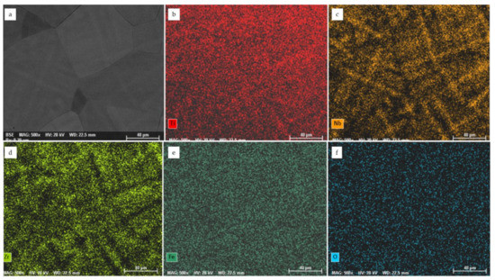 Distribution of alloying elements for the sample Ti29.3Nb13.6Zr1.9Fe in a cast state: (a) -SEM-BSE image of the analyzed field; (b) -Ti distribution; (c) -Nb distribution; (d) -Zr distribution; (e) -Fe distribution; (f) -O distribution.