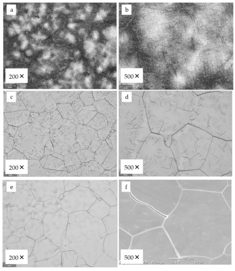 OM microstructure of the alloys: (a,b) Ti10Nb10Zr5Ta; (c,d) Ti20Nb20Zr4Ta; and (e,f) Ti29.3Nb13.6Zr1.9Fe in a cast state.