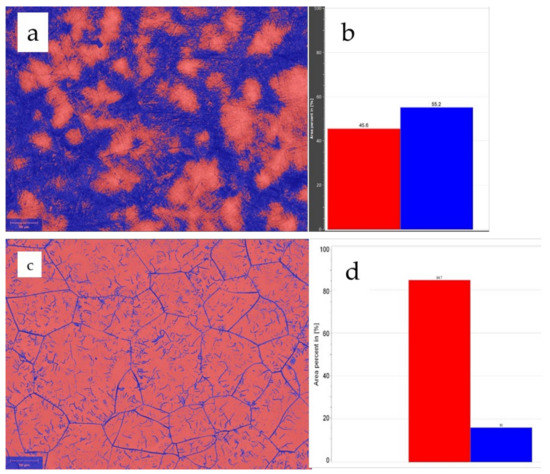 OM microstructure of the alloys: (a,b) Ti10Nb10Zr5Ta; (c,d) Ti20Nb20Zr4Ta in a cast state. Blue color indicates α-Ti phase while red color indicates β-Ti phase.