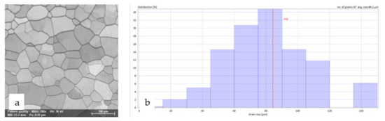 The Ti29.3Nb13.6Zr1.9Fe alloy also demonstrated a casting structure with large equiaxed grains (Figure 4e,f), consisting of the β-Ti phase, as was expected given the high concentration of β-stabilizing elements. The grains appeared uniformly in the structure, with an average size of 84.2 μm; 87 grains appeared on the analyzed surface (Figure 6).