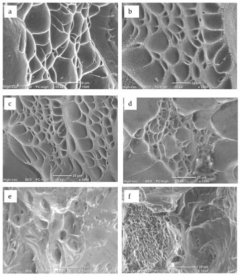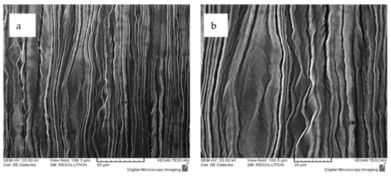 Following the mechanical characterization, the fracture surfaces were analyzed. As reported in Figure 10, the predominant mechanism of the fracture consisted of a mixture of plastic flow and fracture (due to increasing ductile voids), both of which are characteristic of ductile behavior.
