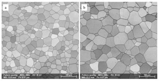 Recrystallization was performed, using different times, in order to convert the microstructure and to control the grain arrangement in the material. This aspect is very important to guarantee a higher ductility in the material, even if a decrease in the strength and the hardness of the alloy is expected. After recrystallization, the grains turned into an equiaxed shape (Figure 9). The microstructure of the alloys after recrystallization was refined with defect-free grains determining improved properties compared to the coarse structure developed in the cast state. As the duration of the recrystallization increased from 5 min to 15 min, the grain size increased. The morphology and the distribution of the grains for the recrystallized alloy (5, 15 min) are reported in Figure 10, while the number and the size of grains on the analyzed surface are reported in Table 4. The grain size also had a significant effect on the corrosion resistance, which increased as the grain size decreased [8]. However, at the same time, the development of different textures and the creation of internal stress can also affect the corrosion resistance and, according to one study [44], there are some unanswered questions as to the real relationship between grain size and corrosion resistance. From the analysis carried out in this study, it appears that recrystallization for 5 min is adequate for achieving the desired microstructural features; this also guarantees acceptable mechanical performances, as reported below.