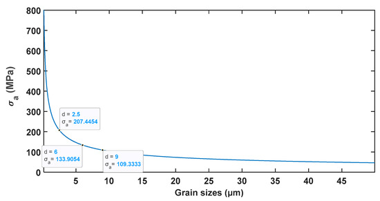 The grain size determines the maximum distance that dislocations travel before encountering an obstacle, defined by the thickness of α laths of Ti6A4V. The Hall–Petch equation for Ti6Al4V(ELI) for a wide range of grain sizes, taking as 0.328 MPa.m1/2 [26], is shown in Figure 3. Owing to the low volume fraction of β-phase recorded in the three different sample types, C (3.6%), D (6.4%), and E (6.6%), of the DMLS Ti6Al4V(ELI) [21], the contribution of the β-phase to athermal stress in this study was ignored. As noted in Section 3.1, it was assumed that the β layers themselves act like typical grain boundaries in a single-phase material. The average thicknesses of the α-laths of samples C, D, and E, as seen in Figure 2 and reported in [20,21], are 2.5 μm, 6.0 μm, and 9.0 μm, respectively. As seen in the insert labels in Figure 3, the contribution of the athermal stress to the yield strength for the three different microstructures of DMLS Ti6Al4V(ELI) is 207.45 MPa, 133.91 MPa, and 109.33 MPa for samples C, D, and E, respectively.
