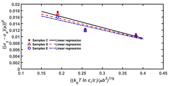 It is of interest to note that, in this formulation, the viscous drag effect at high strain rate discussed in Section 3.3 is not captured and its introduction in Equation (16) would further lower the term . The viscous drag effects become significant for the high strain rates above 103 s−1 [39,40] and is therefore assumed to be insignificant at a strain rate of 750 s−1. With this assumption, the variation of the normalised thermal-activated part of yield stress with the coupled effect of the strain rate and temperature term for samples C, D, and E, was plotted at a strain rate of 750 s−1, giving rise to the graphs shown in Figure 5.
