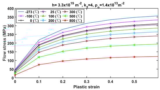The effects of temperature on strain hardening of Ti6Al4V were first investigated using Equations (10) and (15) at temperatures ranging from −273 °C to 800 °C at a constant initial dislocation density () and constant calibration parameters and as seen in Figure 6.