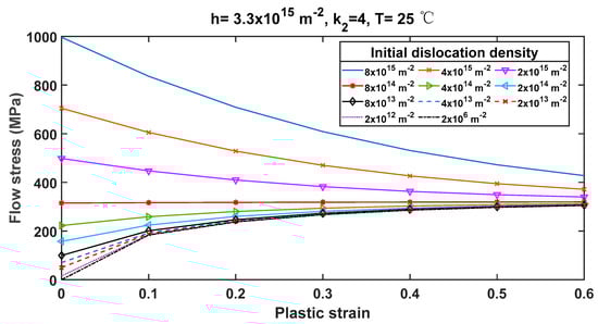 Effects of the initial dislocation density on the flow stress for fixed values of parameters and as well as temperature.