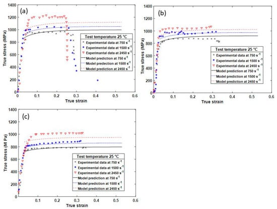 Experimental flow stress curves and those predicted by the model (without the viscous drag effect) at a test temperature of 25 °C and different strain rates for samples (a) C, (b) D, and (c) E.