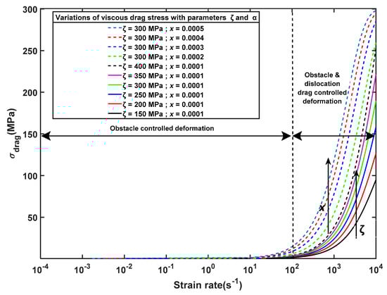 Figure 9 shows the evolution of the viscous drag stress as a function of strain rate and at different values of the curve-fitting parameters and . It is evident in this figure that, at low and moderate strain rates (), the viscous drag component is small and negligible at all values of and . In such cases, the material strain rate sensitivity and deformation are mainly controlled by obstacles. As the strain rate increases (), the viscous drag becomes relevant and quickly rises with the deformation rate, as seen in Figure 9.