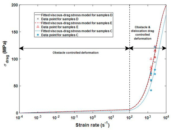 The increase in the strain rate and the two curve-fitting parameters and all lead to an increase in viscous drag stress, though the effect of strain rate is clearly seen in this figure to be more predominant. Equations (11) and (12) were then used together with experimental data for samples C, D, and E to evaluate the values of the curve-fitting parameters and as shown in Figure 10, with the results shown in Table 4.