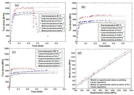 Comparison of the modified model prediction and experimental results for sample D at three high strain rates and at test temperatures of (a) 25 °C, (b) 200 °C, and (c) 500 °C, and (d) the correlation between the predicted values and those obtained from experimentation at yielding and at a strain of 0.2.