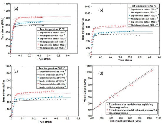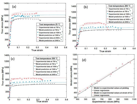 Comparison of the modified model prediction and experimental results for sample E at three high strain rates and at test temperatures of (a) 25 °C, (b) 200 °C, and (c) 500 °C, and (d) the correlation between the predicted values and those obtained from experimentation at yielding and at a strain of 0.2.