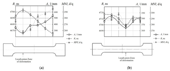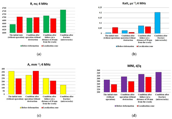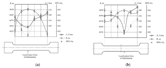 - The structure of the metal in the zones of localization of deformations directly affects the characteristics of non-destructive tests. The characteristics of non-destructive tests for all investigated states of samples made of structural and heat-resistant steels in the zones of localization of deformation had similar values: the delay time of the surface acoustic wave was 4700 ± 5 ns; attenuation coefficient of the surface acoustic wave 0.006 ± 0.003 μs−1 and 0.004 ± 0.002 μs−1; the amplitude range of the received signal of the surface acoustic wave is 227 ± 12 mm−1 and 302 ± 14 mm−1 and the intensity of magnetic noise is 275 ± 31 units and 400 ± 19 units for structural and heat-resistant steels, respectively. The possibility of detecting zones of localized deformation by the spectral-acoustic control method in structural and heat-resistant steels has been found.