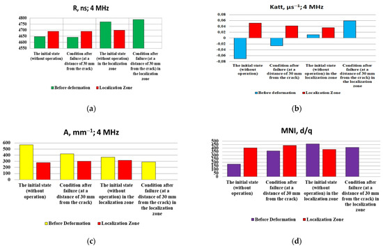4.3. Discussion of the Results of Measuring the Acoustic and Magnetic Characteristics of the Metal of Samples of Power Equipment Made of Structural and Heat-Resistant Steels before Deformation and in Zones of Stable Localization of Deformation