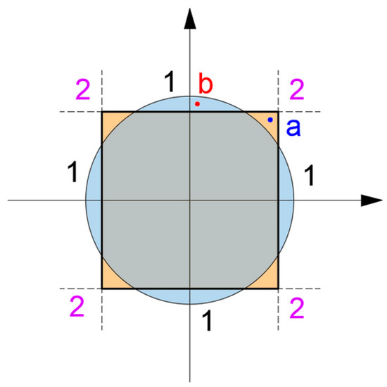 Considering the complex relevance and data characteristics between mechanical property and parameters, the MSVR method was satisfied for modeling. MSVR is the multi-dimensional output form of support vector regression (SVR), and SVR is the form of support vector machine (SVM) in the continuous function domain [23]. The SVM method is a learning mechanism based on the Vapnik–Chervonenkis dimension theory of statistics and the principle of structural risk minimization; SVR transforms a nonlinear problem into a linear problem. It optimizes the promotion ability by balancing the complexity and learning ability of the limited sample information. The input parameters would have data information loss problems such as unfair punishment while directly using SVR to perform regression modeling on multiple objectives. As shown in Figure 2, the square area formed under the two-dimensional output SVR. The data located in area-1 will be punished once, whereas the data in the sensitive area-2 where multiple objectives overlap will be punished twice. Additionally, the existence of data-b will be punished, but there is no penalty for data-a. In this regard, the hyperplane loss area is used to replace the insensitive loss band, as shown in the circular area in Figure 2, so as to ensure the fairness of the penalty function for each sample.