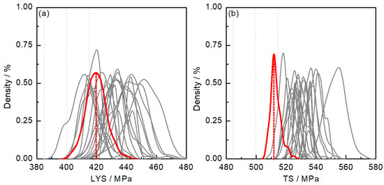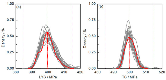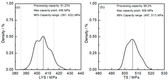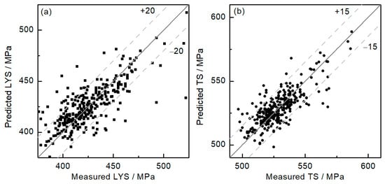 Figure 4. The prediction results of the quality prediction model: (a) LYS (lower yield strength); (b) TS (tensile strength).