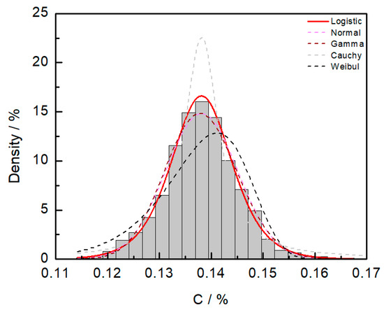 The different distribution functions were estimated by the maximum likelihood estimation method [29]. While fitting the random distribution functions of the key parameters, the most suitable distribution for each parameter could be directly judged according to the error of different fitting results. Taking the parameter “C” as an example, the fitting result is shown in Figure 6. By comparing the obtained fitting distributions, the logistic distribution was found to be the most suitable distribution for parameter “C”. Other process parameters also found their most suitable distribution by this method. The random distribution functions are shown in Table 2, and their fitted density curves are shown in Figure 7.