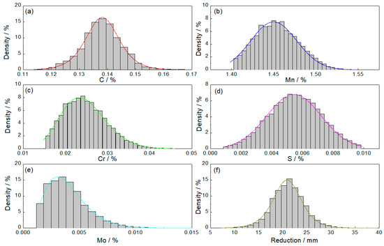 Figure 7. Fitting results of process parameter control ability: (a) C; (b) Mn; (c) Cr; (d) S; (e) Mo; (f) reduction.