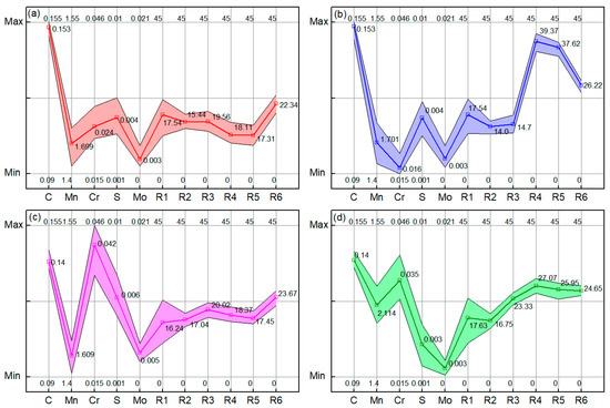 Figure 10. The key process parameter processing control windows: (a) Order A; (b) Order B; (c) Order C; (d) Order D. R1 is the reduction of the first pass. R2 is the reduction of the second pass. R3 is the reduction of the third pass. R4 is the reduction of the fourth pass. R5 is the reduction of the fifth pass and R6 is the reduction of the sixth pass.