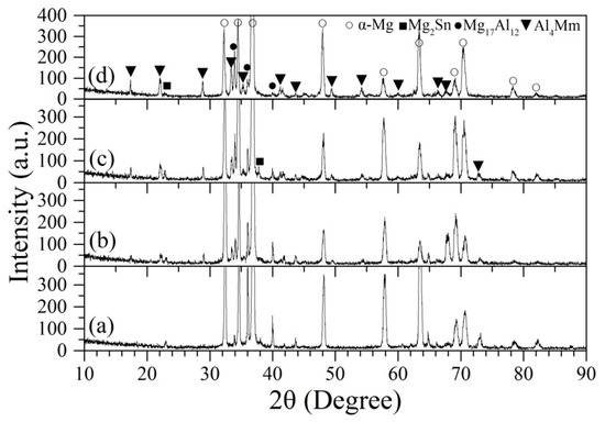 Figure 1 shows the XRD patterns of as-cast samples. ATZ731 alloys clearly consist of α-Mg, Mg17Al12, and Mg2Sn phases (Figure 1a) similar to those in Mg-Al-Sn-(Zn) alloys [34]. Small amounts of Mm addition caused the new diffraction peaks (Figure 1b–e), which are identified to be Al4Mm (most of Al4Ce) [35]. Moreover, the strength of Al4Mm intensity increased with Mm increasing. For the ATZE7312 alloy, the intensity of Al4Mm became strong, while that of Mg17Al12 at ~36° changed to weak compared with ATZ731 alloy, indicating that the increasing Mm promotes the formation of Al4Mm but suppresses the Mg17Al12 phase. From the evolution of Mg2Sn diffraction peaks, it seems that the Mm addition has a little effect on Mg2Sn may be related to the detection limit of XRD. The formation of the Al4Mm phase was explained by the different electro-negativity between Mm and Mg, Al, Sn, Zn, which suggests that Mm easily reacts with Al [23,35]. This new phase is Al4Mm, but not the Al11Mm3 phase, which appeared in Mg-Al-Mm alloy where the Mm/Al mass ratio is above 1.4 as recommended by Pettersen [36]. Su et al. [35] investigated the Al-Ce intermetallic compounds in as-cast Mg-Al-Zn-Ce alloys by thermodynamic calculation and the experiments in which the alloys were prepared by gravity casting. It was found that Al4Ce formed because of the low atomic ratio between Ce and Al as well as the dominant kinetic conditions, which is more likely to satisfy the nucleation and growth requirements of the Al4Ce compound. None of the Zn-containing phase was detected, possibly due to the low content of Zn in samples and the relative high solid solution of Zn in Mg (6.2 wt.% in eutectic temperature) according to binary Mg-Zn phase diagram associated with the other papers [19,20]. Besides, the melting temperatures of Al4Mm are higher than that of Mg17Al12 (i.e., Al4Ce of 1276 °C, Mg17Al12 of 437 °C) [35]. Thus, the thermally stable Al4Mm phase can strongly affect the tensile properties of alloys at a high temperature.