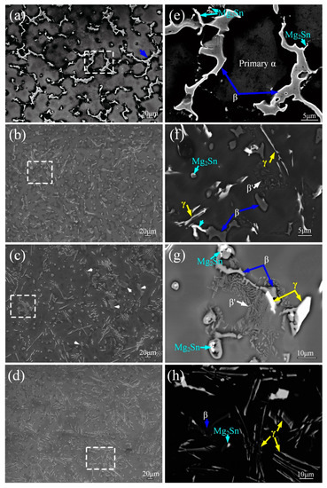 The typical SEM morphologies of as-cast samples for (a,e) ATZ731, (b,f) ATZE7310, (b,c,f,g) ATZE7311 and (d,h) ATZE7312. Note that (e–h) are the high magnification BSD of local (a–d) as pointed by the dotted line square respectively. β represents Mg17Al12 phase, while γ is Al4Mm phase.