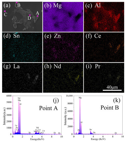 SEM morphology of as-cast ATZE7311 alloy and the EDS results. (a) surface morphology, and (b–i) are the corresponding distribution of Mg, Al, Sn, Zn, Ce, La, Nd and Pr on (a), respectively. (j,k) are the point EDS results of the points of A and B in (a).