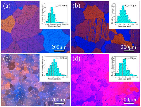 Optical images of solution-treated samples for (a) ATZ731, (b) ATZE7310, (c) ATZE7311 and (d) ATZE7312. The insets are the corresponding statistics results of grain size with dave represents the average values of grain size.