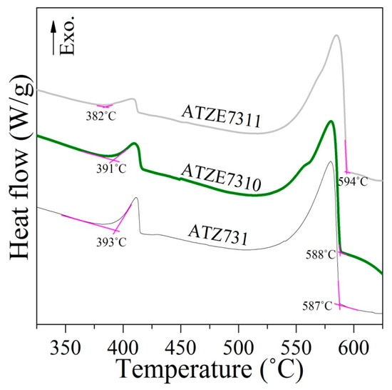 The typical DSC curves of as-cast samples for ATZ731, ATZE7310 and ATZE7311.
