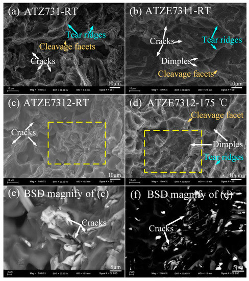 The typical tensile fracture morphologies of as-cast samples tested at RT and 175 °C. (a) ATZ731 at RT; (b) ATZE7311-RT; (c) ATZE7312-RT; (d) ATZE7312-175 °C; (e) and (f) are the high magnify BSD of local (c) and (d), respectively, as pointed by the dotted-line square.