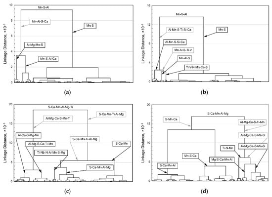 Dendrograms of clusters of NMIs compositions in the studied steels. (a) 9MnSi5; (b) B; (c) X70; (d) 30CrMnSi.