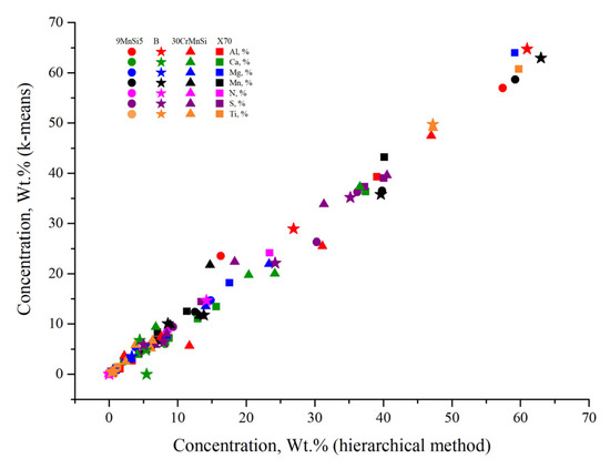 Another difference was found in the mean areas of inclusions in each cluster. The average size of inclusions in the clusters identified by the hierarchical method is slightly higher than the clusters identified by the k-means method. However, an analysis of the databases of NMI compositions obtained for other samples showed that this difference is not of a systemic nature (Appendix A) and is associated, first of all, with the redistribution of inclusions of different sizes with similar chemical compositions between different clusters. The confidence band for determining the average area is on average 5–15%, so this difference between the two methods is small.