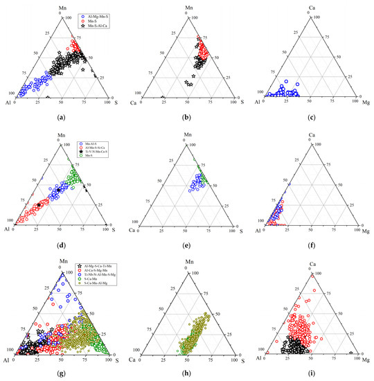 In optimally modified steels X70 and 30CrMnSi in the Al-Mn-S coordinates (Figure 3g,j), NMIs are located in a triangle between the aluminum corner, the sulfur corner, as well as points on the Mn-S axis, corresponding to almost pure manganese sulfide. In steels treated with calcium with big consumption, in all clusters the number of Ca-S inclusions increases, and new clusters appear on their basis. Therefore, in the coordinates Al-Mn-S, a shift toward the angle S appears due to the appearance of other sulfide-forming elements except manganese. In the Ca-Mn-S coordinates (Figure 3h,k), for the same reason, inclusions are concentrated along the line from a point on the Mn-S axis, corresponding to pure manganese sulfide, to a point on the Ca-S axis, corresponding to calcium sulfide. It is along this line that the evolution of the composition of sulfides from MnS to CaS proceeds. The analysis of these diagrams shows that the modification of steel X70 (Figure 3h) was carried out more efficiently, since this steel does not contain pure manganese sulfides, in contrast to steel 30CrMnSi (Figure 3k). In the coordinates Al-Mg-Ca (Figure 3i,l), the oxide inclusions are located along the line from the calcium angle to the point corresponding to the spinel concentration. However, in steel 30CrMnSi, which had been waiting for casting for a long time, one of the clusters is displaced almost to the magnesium angle due to the large inclusion of refractory erosion products (Figure 3l).