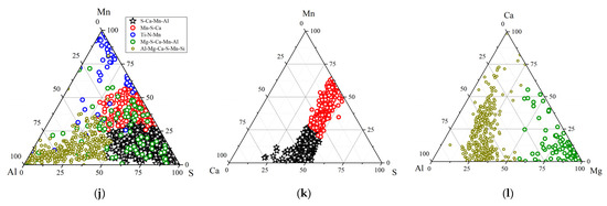 Chemical compositions of nonmetallic inclusions in the studied steels, presented on ternary diagrams in the coordinates of the elements most often found in NMi: (a–c) 9MnSi5, (d–f) B; (g–i) X70; (j–l) 30CrMnSi.