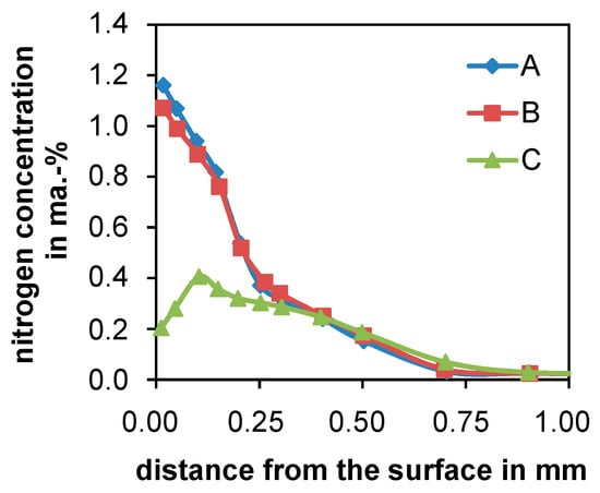 Figure 2 shows the nitrogen profiles after the three carbonitriding treatments with different processing. Due to the same treatment temperature and time of the carbonitriding step, the nitrogen profiles of heat treatments A and B were similar. The additional hardening step of 0.5 h at 1000 °C did not lead to a higher diffusion depth because, at this temperature, most of the ammonia decomposes (see Table 1), and only a small amount of nitrogen is taken by the material (see Figure 2). A different nitrogen profile could be observed after treatment C where a typical vacuum hardening was added after carbonitriding and quenching. During the vacuum treatment, an effusion of nitrogen occurred, and the nitrogen content in the carbonitrided layer decreased.