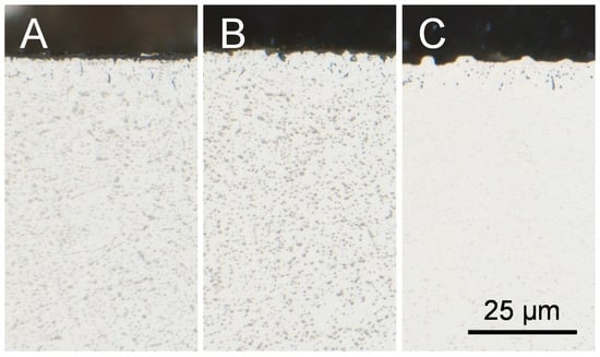 The unetched cross sections in Figure 3 show the different distribution of the carbonitrides in the surface region after the three processing variants. The carbonitride distributions after treatments A and B were very similar. The additional processing step at 1000 °C was not high enough to solve the carbonitrides in specimen B. Instead, they were slightly coarsened. In specimen C, there were not any visible carbonitrides. They were dissolved at the higher hardening temperature of 1050 °C.