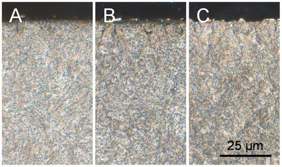 Figure 4 shows the cross sections of the three processing variants etched with Nital. Despite the different hardening temperatures 950 °C (A), 1000 °C (B), and 1050 °C (C), the oxidation of the surface near the region was similar after the different treatments.