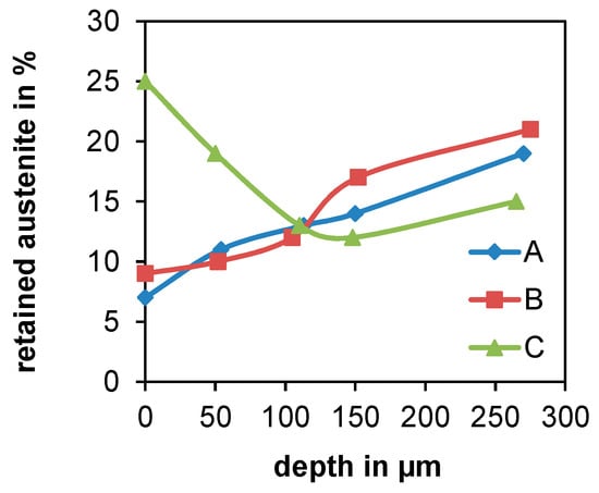 Due to the fact that nitrogen stabilizes the austenitic phase, retained austenite was expected in the surface region. Figure 5 shows the amount of retained austenite in the nitrogen-rich surface layer detected by X-ray diffraction. The treatment variant C had the highest amount of retained austenite at the surface, although the nitrogen content was significantly lower than the one of the two other treatments. This is due to the fact that the carbonitrides were dissolved during the hardening step at 1050 °C, and the nitrogen in the solution was higher than after treatments A and B where the most nitrogen was bonded in carbonitrides and therefore had no effect on the austenite stabilization.