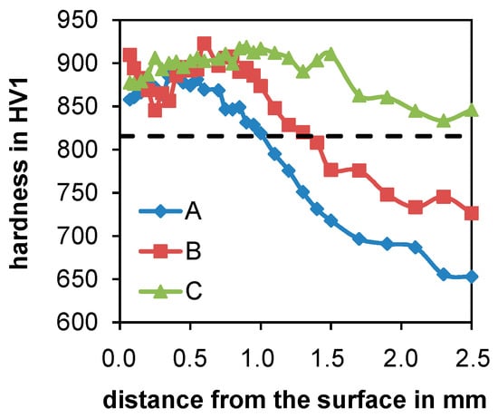 The hardness of the carbonitrided layers is shown in Figure 6. The dashed line is the average hardness of a specimen that was only vacuum hardened and oil quenched. The hardness of the carbonitrided layer that had a thickness of approx. 0.7–0.8 mm (according to the nitrogen profiles) was similar after the different processing and in all three cases higher than the conventional hardened specimen. Beneath the carbonitrided layer, the influence of the different hardening temperatures can be observed. The hardening temperature of treatments A and B was too low. The hardness of the vacuum-hardened specimen could not be reached. Only treatment C, in which the hardening step was identical to the reference treatment, led to the same hardness of the uncarbonitrided material.
