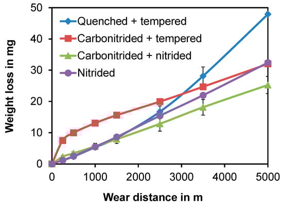 The lowest total loss of mass was observed on the carbonitrided and nitrided specimen. The weight loss was also at its lowest at the beginning of the experiment and increased almost linearly along the wear distance.