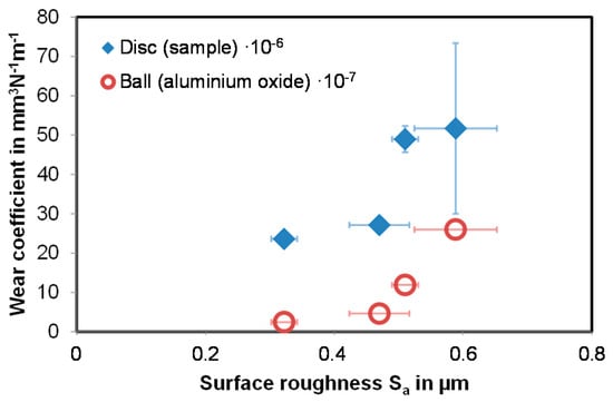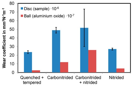 In the ball-on-disc test, the wear coefficients were determined based on the wear marks on the specimen and the ball (Al2O3). Figure 8 shows the wear coefficients that were obtained in this way. It is striking that the carbonitrided specimen as well as the carbonitrided and nitrided specimen had the highest wear coefficients. However, there was also an influence on the surface roughness of the specimens, which was different due to the different heat treatments. Figure 9 shows a clear connection between the wear coefficients and the roughness of the specimen surfaces: the wear coefficient rises as the roughness of the specimen surfaces increases.
