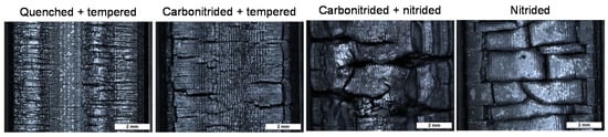 The thermal fatigue behavior was investigated by cyclic induction heating and quenching. Figure 10 shows the specimens’ surfaces of the differently heat-treated material X38CrMoV5-3 (quenched + tempered, nitrided, carbonitrided + tempered, and carbonitrided + nitrided), each after 100 load cycles. Already at first glance, a different risk network can be recognized. In the hardened condition, the cracks were fine and numerous, while a substantially coarser network of cracks was formed in the nitrided condition. The condition of the surface on the carbonitrided and tempered specimens looked similar to the hardened specimen, but the cracks were somewhat larger here. In the carbonitrided and nitrided specimens, the network of cracks looked similar to the specimens that were only nitrided with finer cracks between the coarser network of cracks.