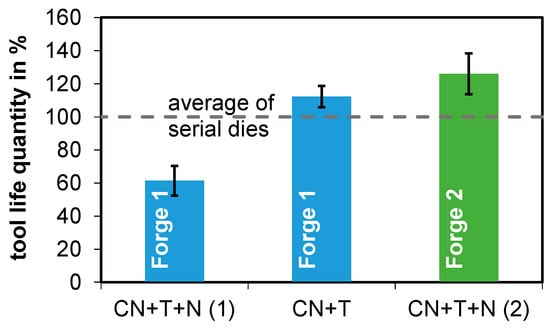 The experimental dies were used in the forges until the lifespan was reached. Figure 11 shows the lifespans achieved by the tools with regard to series life. In forge 1, similar lifespans were achieved with the carbonitrided and tempered tools as with the series tools. The carbonitrided and nitrided tools had a lower tool life quantity than the serial tools.